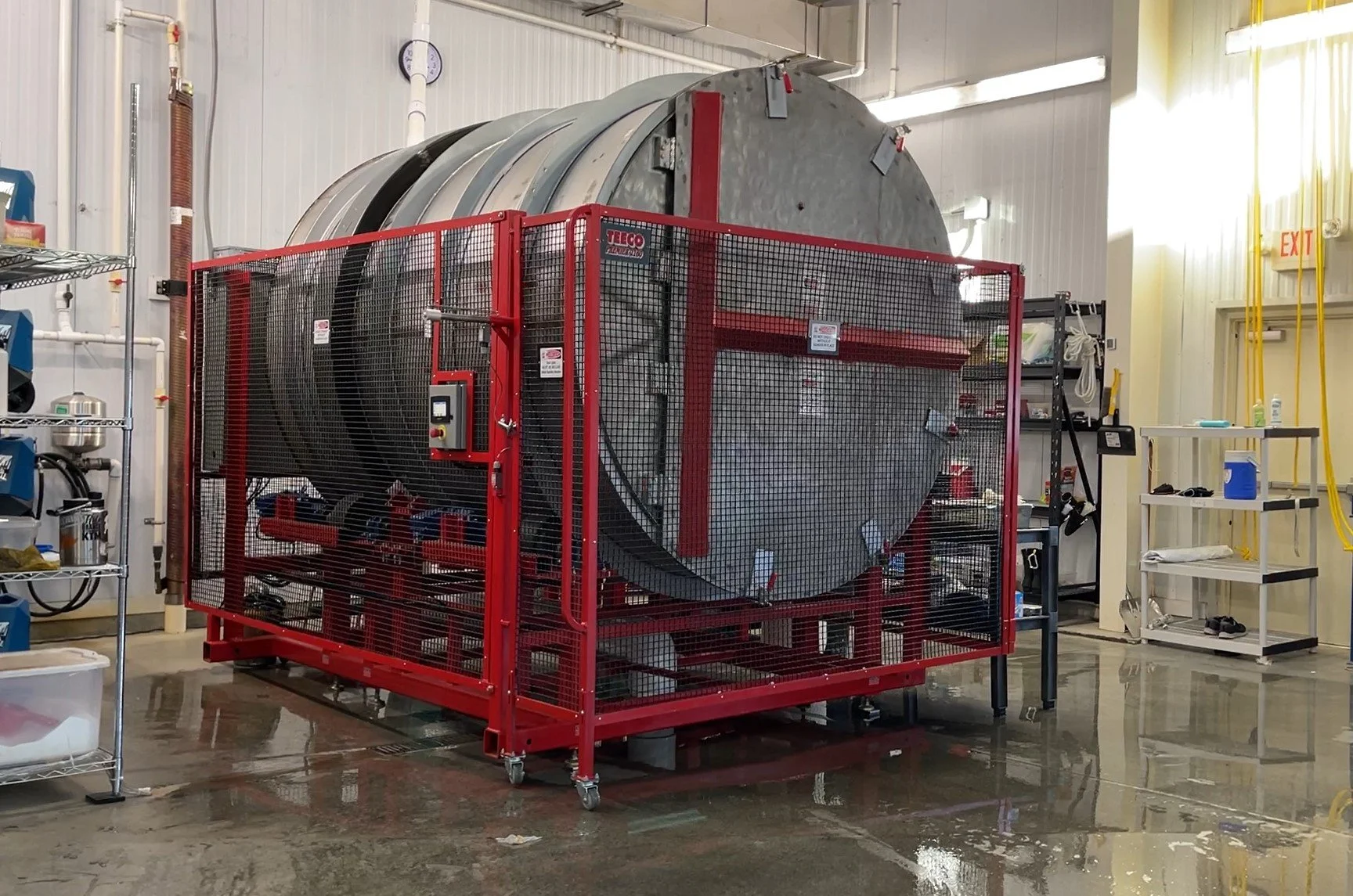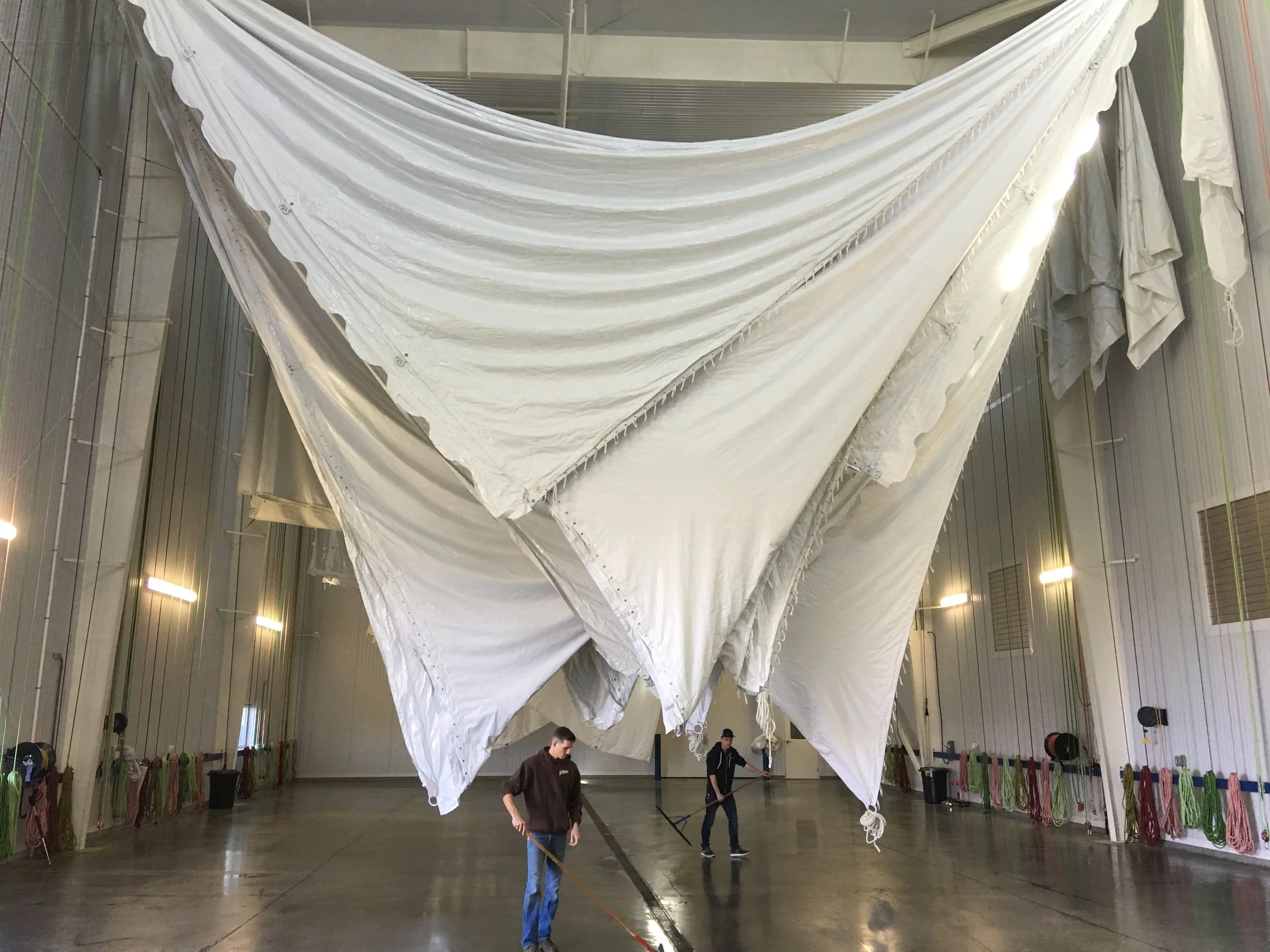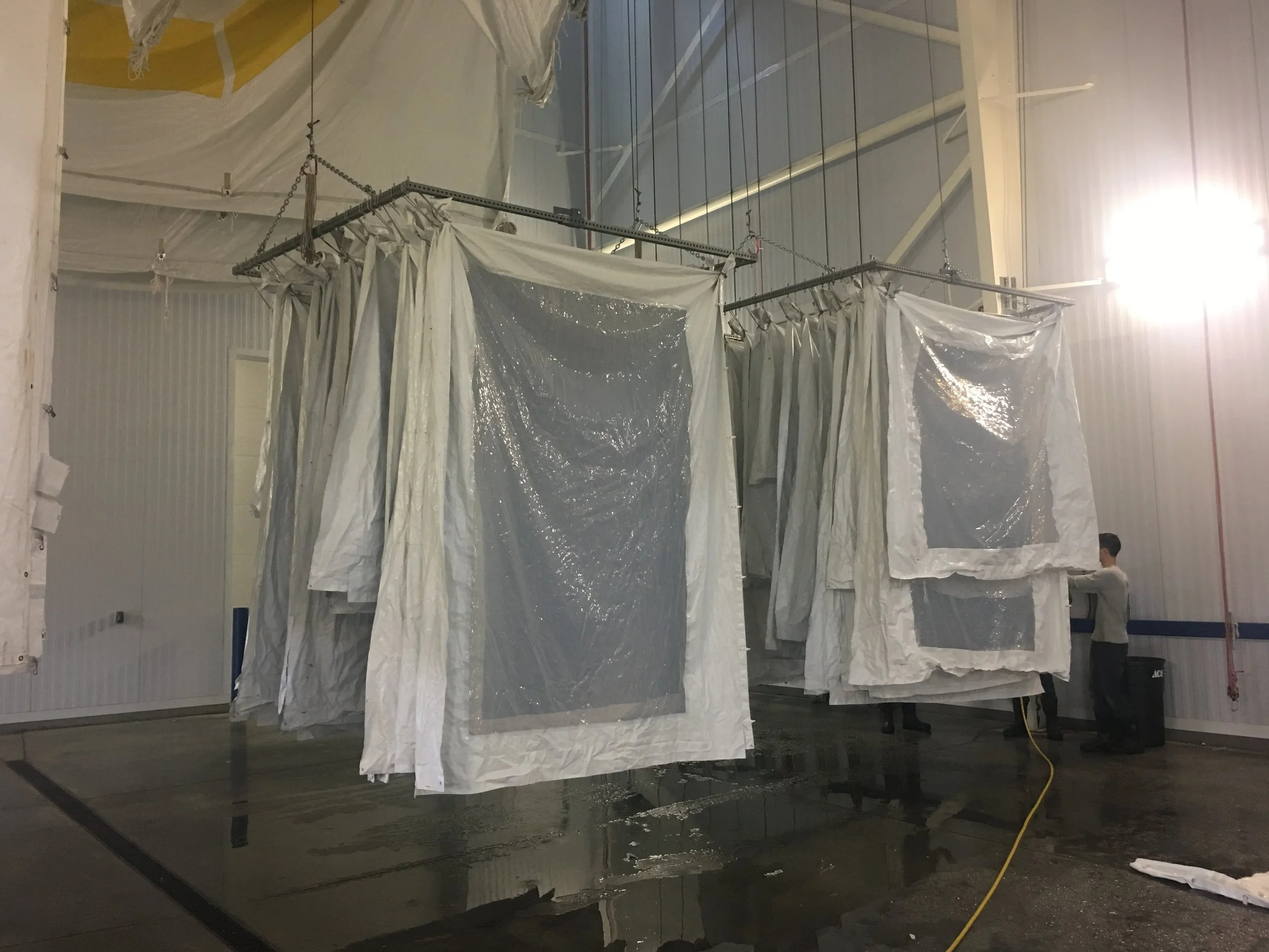 Our yearly tent washing is in full swing. We are working hard to be sure that our tents are looking great for the coming summer season. Our new tent washer can wash 5,000 square feet of fabric in each load. It's just like a giant front-load clothes washer. Here are some pictures of the process.